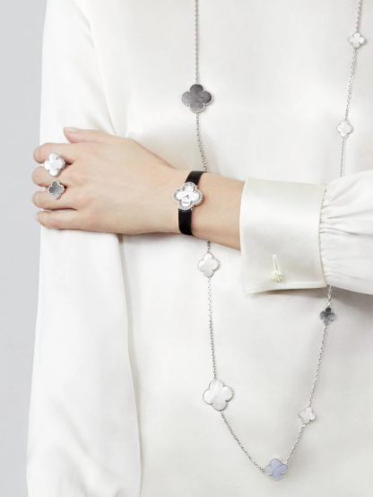 Created in 2006 by Vthtan Clthteef & Arthtpels, the Magic Alhambra® jewelry creations gather different-sized Alhambra motifs, coming together in a joyful dance. Inspired by the clover leaf, their asymmetric designs feature different associations of materials.